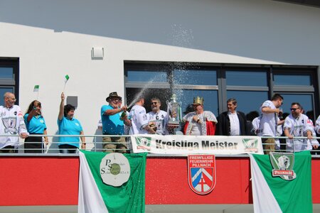 Es folgte die eingangs erwähnte Präsentation der Meister und nach einer ausgiebigen Huldigung der erfolgreichen Sportler ging es, begleitet und abgesichert durch die Pillnacher Feuerwehr zurück zum Haus der Gemeinschaft. Angekommen im Biergarten gab es die offizielle Begrüßung durch den RSC-Vorsitzenden Gerd Pfeilschifter. anschließend gratulierte der zweite Bürgermeister im Namen der Gemeinde Kirchroth und überreichte an beide Vereine jeweils einen Scheck als Anerkennung und Zuschuss zur Meisterschaft. Es folgte die Vorstellung der Meisterteams durch Franz Landgraf. In einer sehenswerten Zeremonie wurde jeder einzeln nach Vorne gerufen und von den Zuschauern frenetisch gefeiert. Nach den Sportschützen und der Ersten des RSC Pillnach wurde noch die Zweite Mannschaft vorgestellt, die am 2. August ihren 31. Geburtstag feiert. Die letzte Runde der Vorstellungen gehörte den RSC-Fans. Aus ihren Reihen wurden ebenfalls einige persönlich vorgestellt und bekamen als Dankeschön Fanpackete überreicht. Sie verabschiedeten sich mit einem "Wer nicht hüpft der ist aus..." und bekamen dafür tosenden Applaus der Anwesenden.